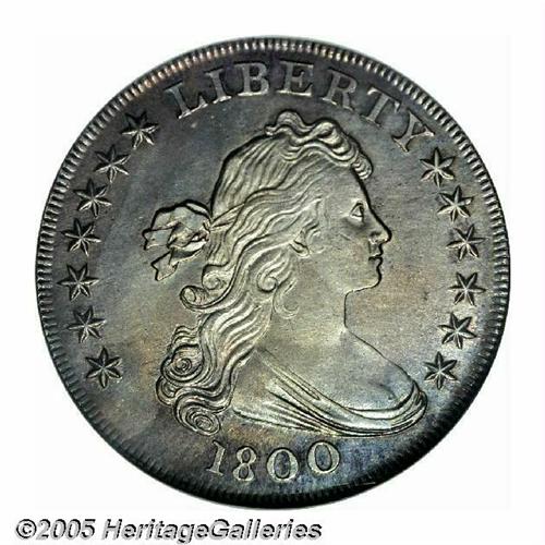<B>1800<S$1> AU53 NGC.</B></I> B-13, BB-193, R.3. The reverse die shows strong clash marks from the obverse, with Liberty's drapery lines through the F of OF and the clouds below (Bolender's "spray" of die breaks). These clash marks look more like a comet trail, hence the attribution as the "Comet" variety. This is a very pleasing early dollar with light golden-gray toning imbued with bluish accents on the obverse and magenta on the reverse. The design elements are sharply defined, with only the eagle's breast feathers displaying weakness, and the dentilation is relatively strong on both sides. Just a couple of minute marks are noted on the smooth, semi-bright surfaces. This coin exudes great eye appeal.<BR><I>From The Melrose Bay Collection.</B></I>