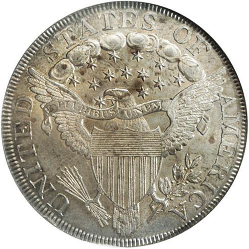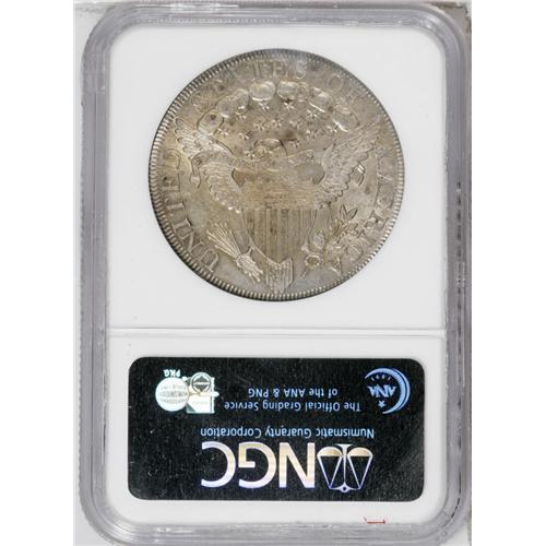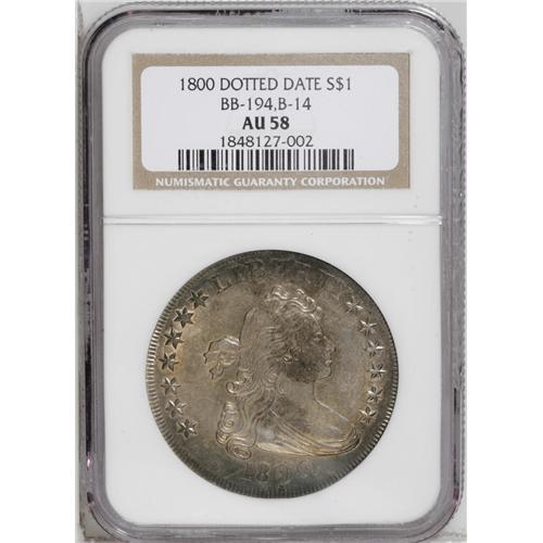 <B>1800<img border='0' src='http://www.heritagecoins.com/images/star.gif' width=10 height=10>$1> AU58 NGC.</B></I> B-14, BB-194, R.3. Die State III, early. A scarce die state of the well known Dotted Date variety, which is extremely popular from its listing as one of the <I>Guide Book</B></I> varieties. The variety derives its name from the dotlike die flaws in and under the first 0 in the date. In this die state, which Bowers and Borckardt call "scarce," there is a hairline crack rising from the rim through star 1 and into the field. A reverse crack runs from D through the wing to S. No clash marks, however, are visible at OF. This piece has pleasing copper-silver-gray surfaces that show just a trace of rub on Liberty's cheek. An appealing near-Mint State example.<BR><I>From The Royal Oak Collection.</B></I>