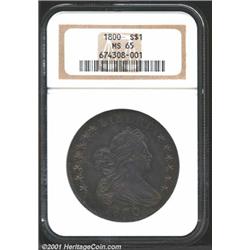 1800 S$1 Dotted Date MS65 NGC.<p>B-14, BB-194. R.3. Intermediate Die State IV-V. The first of two phenomenal Gem 1800 "Dotted Date" Dollars. And what a Gem this is. This piece has the appearance of coming from an "old time collection," such as the early dollars from the World's Greatest Collection Sale. In fact, there is a tiny nick close to Liberty's chin that makes us wonder if there isn't a chance that this might be the Boyd Specimen, noted in the Bowers Silver Dollar book under "Notable Specimens" with a "Nick on the chin." Unfortunately, we may never know as the Boyd Specimen was not plated in either the World's Greatest Collection Sale or the 1949 ANA Sale. The coin has bright, satin-like luster and is toned a beautiful, deep bluish-gray with gold and rose highlights throughout. This beautiful "Dotted Date" was struck from a slightly later state of the dies than the MS66 NGC specimen (see next lot). This example has all of the die breaks listed under Die State IV in Bowers, with die rust very evident on the obverse. Condition Census: This and the MS66 piece are most likely among the finest known.From the Michael Hering Collection. Important notice: We expect to be auctioning lots at the rate of 200-250 per hour. Sometimes eBay Premier live bid software cannot keep up with that pace, so we strongly recommend that you place a realistic proxy bid now as insurance to avoid disappointment. Also please note that all Heritage/CAA lots purchased through eBay Premier carry a 20% Buyer's Premium.