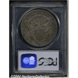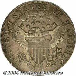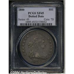 <B>1800<S$1> Dotted Date XF45 PCGS.</B></I> B-14, BB-194, R.2. Die State IV. Deep dove-gray patina embraces this attractively detailed Bust Dollar. The right obverse field has a pair of faint pinscratches, and the upper reverse has brief marks on one of the stars and the right (facing) wingtip. Otherwise, a pleasing example of this popular <I>Guide Book</B></I> variety, named for the several curious die flaws (as made) that surround the first 0 in the date. <BR><BR><B>Important notice:</B> Heritage usually auctions material at the rate of 200-250 lots per hour. On some occasions eBay Live bid software or the Internet may not be able to keep up with the pace of the auction. We recommend placing a realistic absentee bid now as insurance to avoid disappointment. Occasionally the auctioneer may eliminate or reject an eBay Live bid, and the auctioneer may also reopen a lot after the close of the eBay live bidding (usually because we missed an audience bid), and may reject your bid even if it shows you as the winning bidder. By bidding via eBay Live, you agree that Heritage may award the lot to another bidder at its sole discretion under the circumstances described above or any other reasonable circumstances. Since eBay bids are not shown to us until we open the lot on the floor, we treat those bids just like floor bids. In most cases the floor responds before the eBay bid is presented to us, due to Internet lag time, so for consistency we have made it a policy that floor bids are always considered first over tie eBay live bids. Also please note that all Heritage lots purchased through eBay Live carry a 20% Buyer's Premium. Please make sure you read the Terms and Conditions before you bid. </span></font></tr></table></td></tr></table>