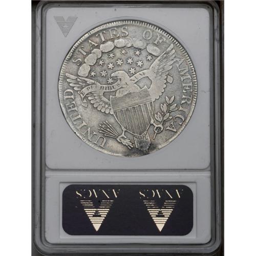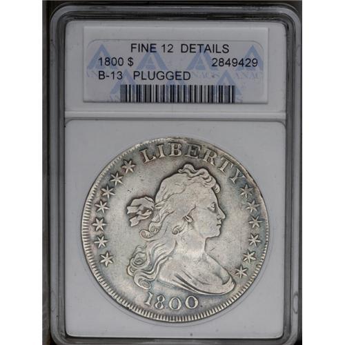 <B>1800<img border='0' src='http://www.heritagecoins.com/images/star.gif' width=10 height=10>$1>--Plugged--ANACS. Fine 12 Details.</B></I> B-13, BB-193, R.4. This whizzed and bright Draped Bust dollar is crudely tooled to repair a hole between the ER in LIBERTY, and opposite on the eagle's tail feathers. The obverse field near 3 o'clock has also been repaired.