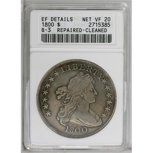 <B>1800 S$1 --Repaired, Cleaned--ANACS. XF Details, Net VF20.</B></I> B-3, BB-183, High R.5. Die State I. Doubled R in LIBERTY; leaf joins base of I just right of center. Apparently always from perfect dies. Although this rare variety is currently considered R.5, it is extremely tough and may actually be a third R.6 variety for the year. Bill Luebke actually believes that it is more difficult than the B-2 rarity. The average grade of known pieces appears to be slightly higher than B-2. Artificial grayish-gold color over cleaned surfaces. Aside from the unusual color, the repair is not immediately obvious. A few unintentional light scratches are evident, along with a few other intentional scratches, including an outline of Liberty's profile.<BR><I>Ex: Scotsman Auctions (7/2004).</B></I><BR><I>From The William Luebke Collection.</B></I><BR><BR><b>Shipping:</b> Coin/Currency (<a target="_blank" href="http://www.heritageauctions.com/common/shipping.php">view shipping information</a>)