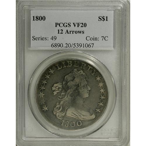 <B>1800 S$1 VF20 PCGS.</B></I> B-13, BB-193, R.4. A second example that is misattributed on the holder by PCGS as the "12 Arrows" variety (BB-196). This example displays honest wear and variations of light-to-charcoal-gray coloration. Obverse stars 2 and 3 are weakly struck, as are some of the reverse dentils. Some faint marks are noted on the portrait, but neither side reveals any really distracting abrasions.<BR><BR><b>Shipping:</b> Coins & Currency (<a target="_blank" href="http://www.heritageauctions.com/common/shipping.php">view shipping information</a>)