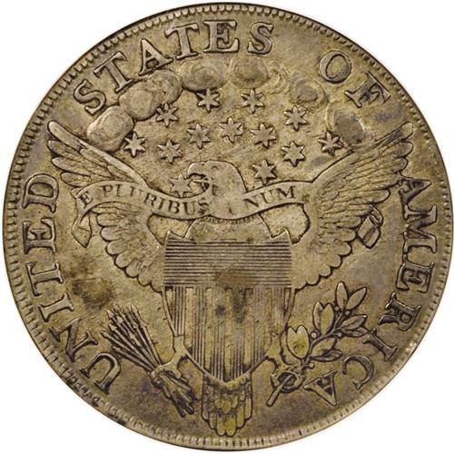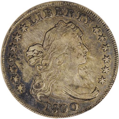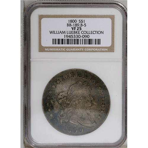 <B>1800 S$1 VF25 NGC.</B></I> B-5, BB-189, R.5. Die State I. Die dot inside lower part of R; die dot left of second T in STATES. The obverse and reverse die flaws are present on all known examples, thus they provide immediate and positive attribution. Like so many 1800 dollars, this is a rare variety. This date provides collectors with an excellent challenge. There are 16 known varieties for the date, including two R.6 varieties, four others that are R.5, and four that are R.4. Thus, 10 out of 16 die combinations are considered scarce or rare, yet there are no impossible rarities to prevent the goal of a complete variety set.<BR> This is an early die state with perfect obverse and reverse dies. Medium gray-brown color on both sides with splashes of gunmetal-blue on the obverse. Each side has its usual share of tiny blemishes, but none are of any significance.<BR><I>Ex: Warren Miller; Jim McGuigan (4/2003).</B></I><BR><I>From The William Luebke Collection.</B></I><BR><BR><b>Shipping:</b> Coin/Currency (<a target="_blank" href="http://www.heritageauctions.com/common/shipping.php">view shipping information</a>)