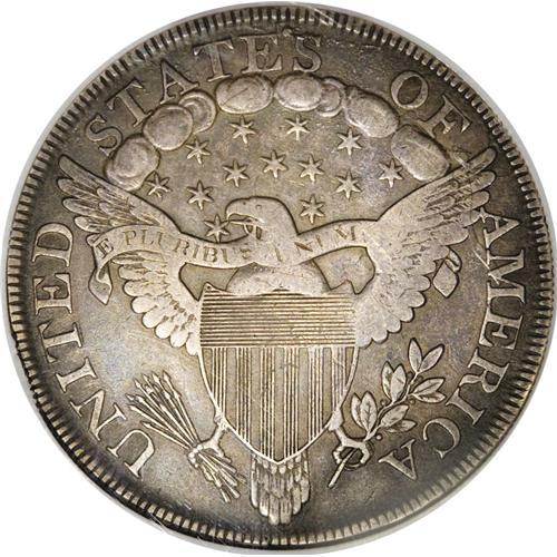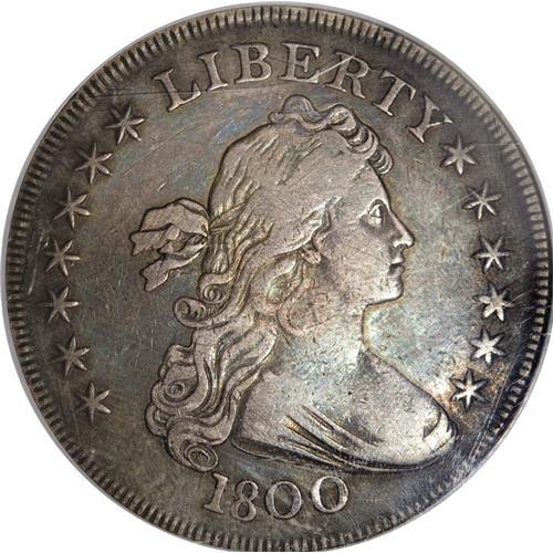 <B>1800 S$1 VF35 NGC.</B></I> B-16, BB-187, R.2. Attributed by a die dot just to the left of Liberty's highest hair curl, and die flaws above ES of STATES on the reverse. Die State III, the roughness above ES developing into a "prominent period-like crack," according to Bowers-Borckardt. This example presents rich rose-gray toning, with cobalt-blue accents on both sides. The strike is excellent, and this piece is only slightly disturbed by a few small abrasions and adjustment marks, almost all of which are located on the obverse. One somewhat heavier linear mark (possibly another adjustment mark) is seen in the field area beneath obverse star 7, stretching to below the I in LIBERTY. A sharp early dollar.<BR><BR><b>Shipping:</b> Coins & Currency (<a target="_blank" href="http://www.heritageauctions.com/common/shipping.php">view shipping information</a>)