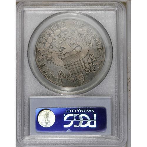 <B>1800<img border='0' src='http://www.heritagecoins.com/images/star.gif' width=10 height=10>$1> Wide Date, Low 8 Fine 15 PCGS.</B></I> B-10, BB-190, R.3. A scarce piece with dove-gray and gunmetal-blue patina over each side. Moderately worn, but original and appealing. Population: 3 in 15, 21 finer (8/06).