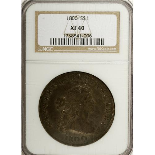 <B>1800 S$1 Wide Date, Low 8 XF40 NGC.</B></I> B-10, BB-190, R.2. Multiple die cracks through AMERICA, as often seen. The surfaces are a deep, glossy gunmetal-gray with only a bit of striking softness noted in the centers. There are not outwardly distracting abrasions or adjustment marks.<BR><BR><b>Shipping:</b> Coin/Currency (<a target="_blank" href="http://www.heritageauctions.com/common/shipping.php">view shipping information</a>)