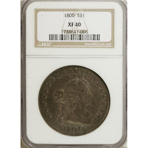 <B>1800 S$1 Wide Date, Low 8 XF40 NGC.</B></I> B-10, BB-190, R.2. Multiple die cracks through AMERICA, as often seen. The surfaces are a deep, glossy gunmetal-gray with only a bit of striking softness noted in the centers. There are no outwardly distracting abrasions or adjustment marks.<BR><BR><b>Shipping:</b> Coins & Currency (<a target="_blank" href="http://www.heritageauctions.com/common/shipping.php">view shipping information</a>)