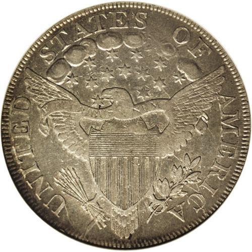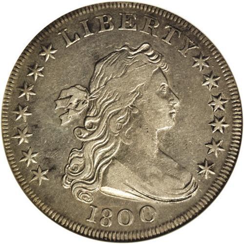 <B>1800<img border='0' src='http://www.heritagecoins.com/images/star.gif' width=10 height=10>$1> Wide Date, Low 8 XF40 ANACS.</B></I> B-10a, BB-190, R.3. Bowers-Borckardt Die State IV. The date is wide apart, with the 0's widely separated and the 8 too low. The highest curl is incomplete. On the reverse in this die state, the die crack through C is more pronounced, and a crack extends from the end of the right ribbon through ER. Both sides of this lustrous coin have a light, mottled and attractive gray-gold patina, with considerable luster remaining.