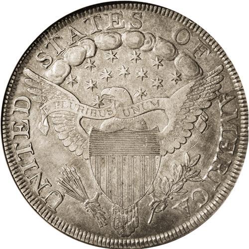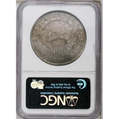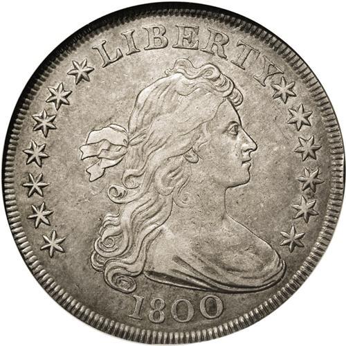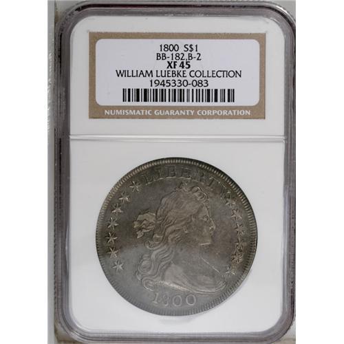 <B>1800 S$1 XF45 NGC.</B></I> B-2, BB-182, Low R.6. Die State II. R in LIBERTY double punched; first T in STATES doubled. Apparently all known pieces are this die state. The reverse die is in a later state than B-1 with a die crack from the border to the first A in AMERICA, although the clash marks of B-1 are no longer present, the die being lightly lapped between marriages. A faint crack is also visible from the center of F to the right wing. Haseltine considered the reverse to be a different die from H-1, although Bolender correctly listed both varieties from the same reverse die.<BR> This is an important die variety, with only a couple dozen known today. Only 19 varieties in the entire early dollar series are currently rated as R.6 through R.8, excluding the proof novodels. Nine of the 19 are 1795 varieties, and two are dated 1800, including this variety and B-20. Of the remaining rarities, two are dated 1796, five are dated 1798, and one is dated 1803.<BR> In addition to the rarity of this die marriage, it also has a low average grade. The finest "Notable Specimen" Bowers listed was graded XF45+, although it would probably be certified as AU in today's grading environment. It was offered as lot 1019 in Stack's January 1989 sale. The piece offered here is tied with two others as second best, being given a conservative grade of VF30 in the Willasch catalog. This example is certainly in the Condition Census for the variety and is probably the second or third finest known. It is marginally finer than the DeCoppet-Reiver coin that was similarly graded VF30 in Bowers' "Notable Specimens" list. It is also finer than the Chalkley coin and appears to be slightly better than the Spies coin.<BR> An attractive medium grayish-gold example with traces of luster beneath the toning. A minor obverse rim bruise is visible at 3 o'clock. The cataloger for the Willasch coins made these comments: "Somber gray toning with hints of original frost peering out from the fields. ... Some minor rim marks, one on the obverse and a few tiny ones on the reverse are the only evidence of circulation aside from wear." The coin realized a mere $880 in that sale. <BR><I>Ex: H. Roland Willasch Collection (Superior, 5/1990), lot 555; Evan Gale (9/2003).</B></I><BR><I>From The William Luebke Collection.</B></I><BR><BR><b>Shipping:</b> Coin/Currency (<a target="_blank" href="http://www.heritageauctions.com/common/shipping.php">view shipping information</a>)