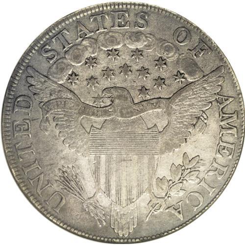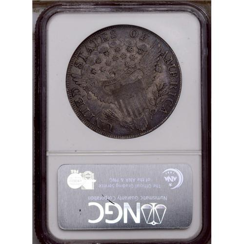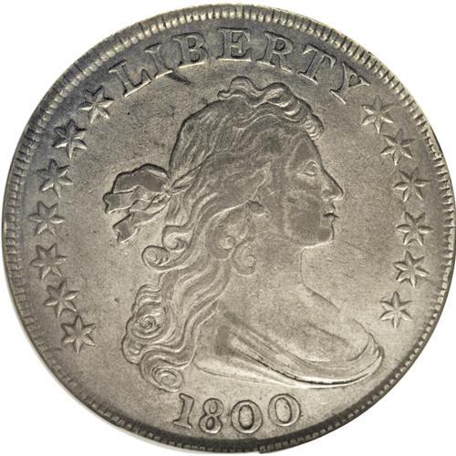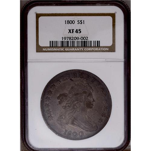 <B>1800<img border='0' src='http://www.heritagecoins.com/images/star.gif' width=10 height=10>$1> XF45 NGC.</B></I> B-5, BB-189, R.4. Dusky dove-gray and walnut-brown toning drapes this attractive example, which retains glimpses of subdued luster in protected areas of the designs. The center of the shield and the hair above the ear are typically struck. A few inconsequential rim dings are barely worthy of mention, and the fields and devices are free from unpleasant marks.