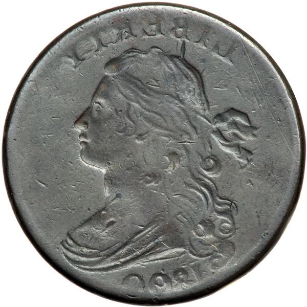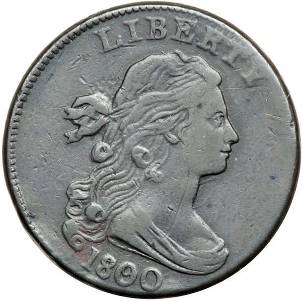 1800 S-194 R3 Overdate 80 over 79, Style II Hair F15. Obverse Brockage with Rotation. Sharpness VF20 but there is a dull hairline scratch down the neck and a pair of light rim bruises just left of the lowest curl. Otherwise the surfaces are smooth and display only a few minor contact marks. Glossy chocolate and darker steel brown. Sharply impressed dentils are clearly visible above ERT in LIBERTY. While this obverse die was used on both S-194 and S-195, the die state is consistent with the earlier S-194 marriage. The incuse obverse impression on the "reverse" is rotated 35 degrees CW from a normal head-to-head brockage impression. The overdate feature is bold. An attractive example of a neat error strike. Graded VF20 by Bland. DWH #0211.