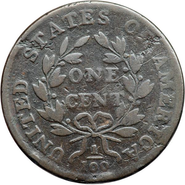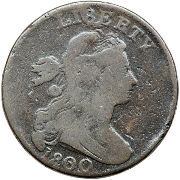 1800 S-197 R1 G6. Glossy chocolate brown with slightly lighter steel brown toning on the devices. No corrosion or verdigris, but there are some contact marks, including a collection of shallow digs at ST in STATES and another at the F in OF. The date is strong and the legends are clear.