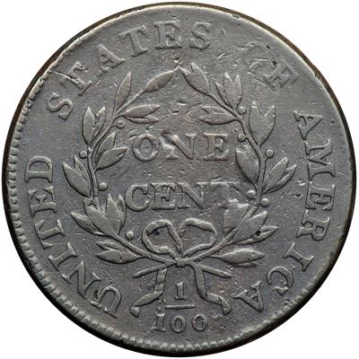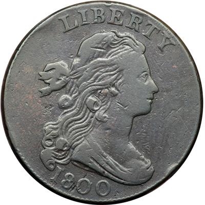 1800 S-198 R5+. Fine-12. Noyes Plate Coin. Glossy uniform chocolate and steel. The surfaces are smooth and are affected by only light contact marks. The notable marks are a tiny rim bruise just above the bust tip, another left of the L in LIBERTY, a thin horizontal nick in the hair near the top of the head, and a shallow dent or planchet flake in the hair at the back of the head, plus a thin planchet void slanting between the 8 and first 0 in the date. A faint hairline scratch shows in the field before the portrait if you catch the light at just the right angle. MDS, Breen state III. A fine die cracks arcs through ICA. Listed as VG10 and tied for finest known honors with one other piece in the Bland census. Noyes also grades this piece VG10 and says it is CC#1 by itself, his photo #27758. Your cataloger has long felt this cent deserves a slightly higher grade. Removed from a PCGS slab graded VF20 (PCGS label included, and it shows the attribution and Husak provenance). Plated in the Noyes book to illustrate the die variety. PCGS Population 1; The only example graded at PCGS for the variety. DWH #3484.