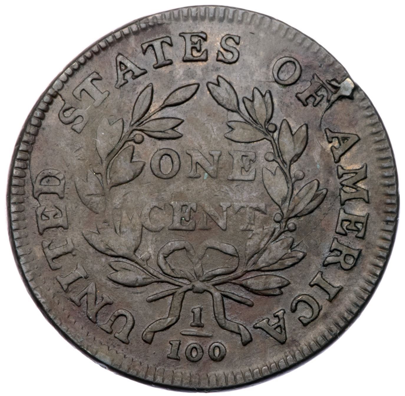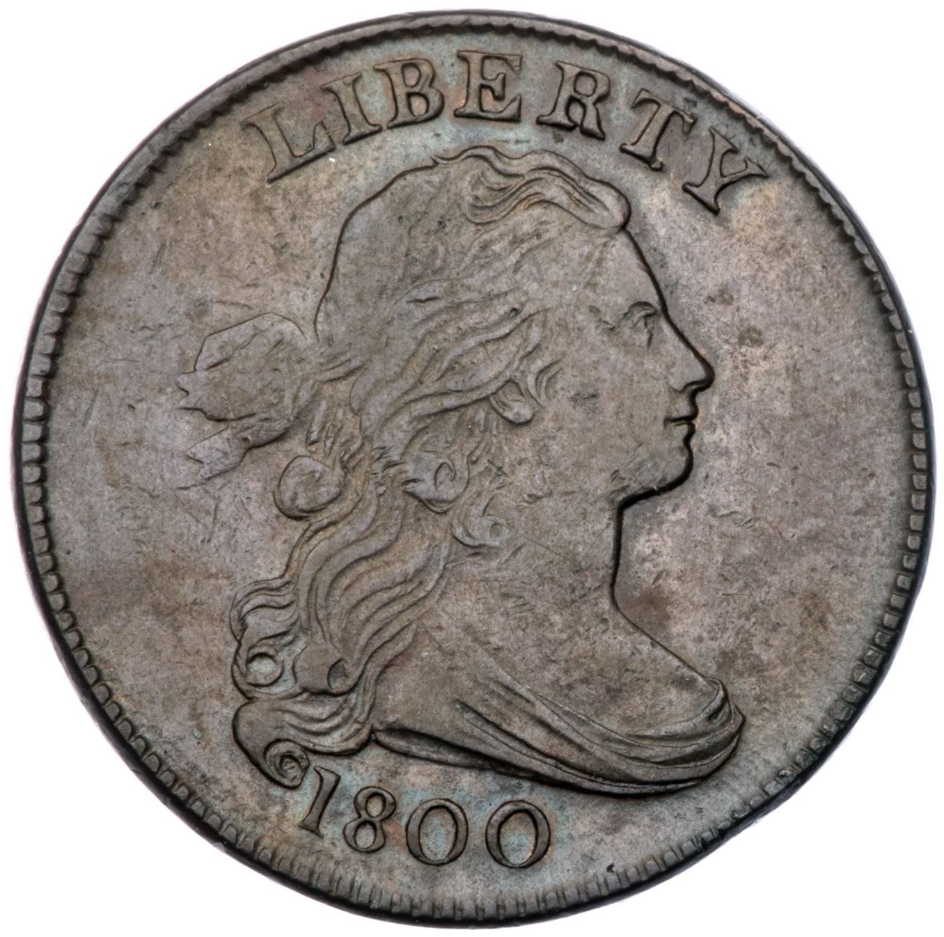 1800 S-199 R4 VF25Glossy light olive and chocolate brown with some slightly darker toning at OF AMER. Smooth with trivial contact marks, none notable. MDS, Breen state V, with a small but bold cud break at the F in OF in addition to other cracks and swelling on the reverse. Called VF25 net F15 and tied for CC#9 in the Noyes census, his photo #26689.Certificate Number: Pedigree: Ex George Ross-George Ramont-Fred H. Borcherdt Collection (includes the Ramont collection envelope)