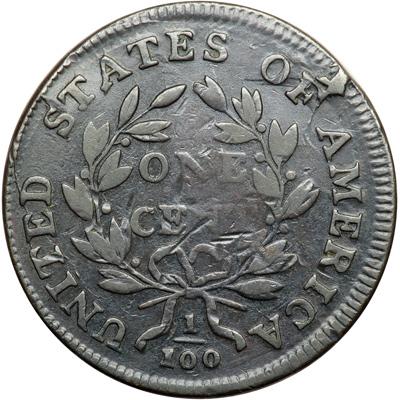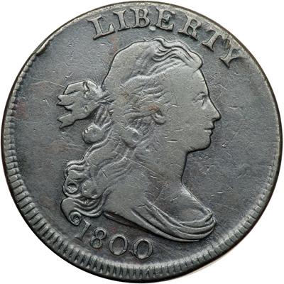 1800 S-199 R4. VG-10. A couple points sharper with a few faint hairline scratches on the obverse, a tiny rim bruise behind the head, and some sharp nicks inside the wreath. Glossy olive and dark steel brown. Smooth except for a couple very small spots of shallow verdigris in the hair left of the ear. The date and legends are complete and very strong. Nice eye appeal in spite of the minor defects. Late die state, Breen state VIII, with strong swelling and several die cracks on the reverse. DWH #3263.