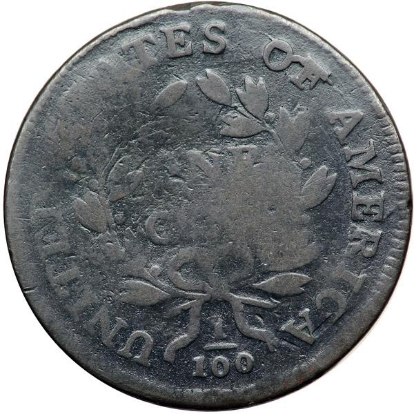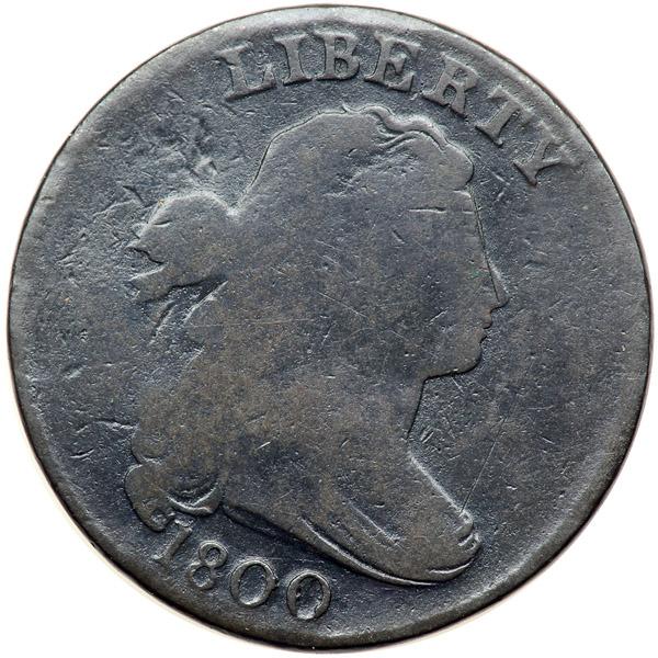 1800 S-200 R3 G5. Mostly glossy dark olive and steel with slightly lighter steel and chocolate toning on the highpoints. No verdigris and only a few minor contact marks, including some dull nicks in the field above the hair ribbon. M-LDS, Breen state VI, with a wide die crack through OF and obvious swelling on the reverse. The date is strong.