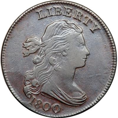 1800 S-200 R3. VF-20 Plus. Glossy medium and darker chocolate brown with some reddish chocolate toning in protected areas on both sides. The surfaces are smooth and show just a few minor contact marks, including a light rim bruise at the I in UNITED, a few tiny pinpricks at ME in AMERICA, and a small nick on the top half of the O in ONE. LDS, Breen state IX, with all the cuds and die cracks listed in the Breen book clear and obvious bulging at several places on the reverse. Called VF20 and tied for CC#12 in the Bland census. Noyes says VF20 net F12 and tied for CC#14, his photo #36937. DWH #2419.