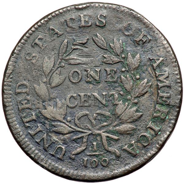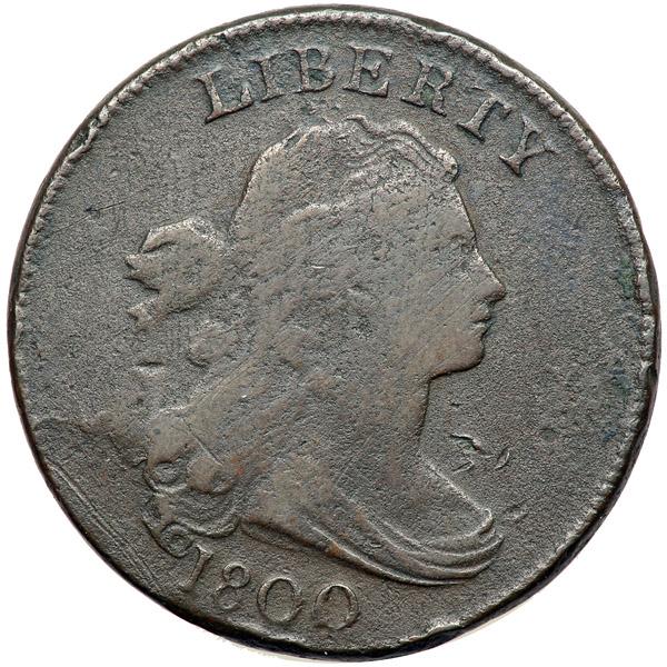 1800 S-201 R4+ G6. Sharpness F12 but covered with fine to moderate roughness, strongest on the reverse where traces of greenish verdigris are caked into a few of the protected areas. There are some small nicks and rim bumps on both sides and a horizontal scrape above the O in ONE. Olive brown and chocolate with darker olive brown in protected areas on the reverse. The date and legends are strong. E-MDS, Breen state II.