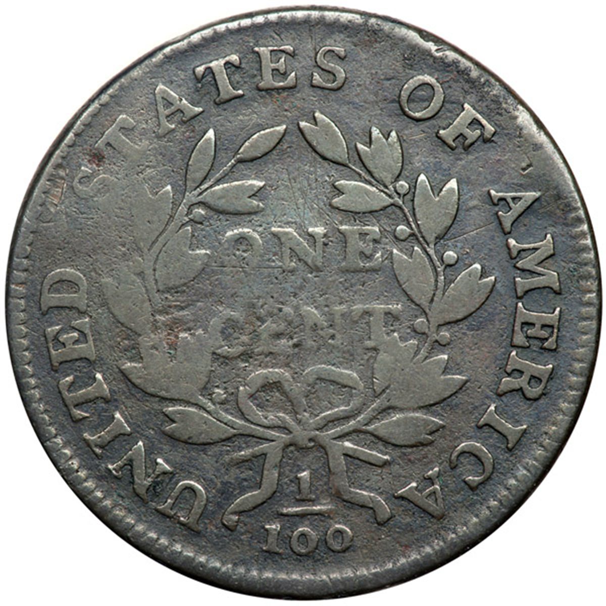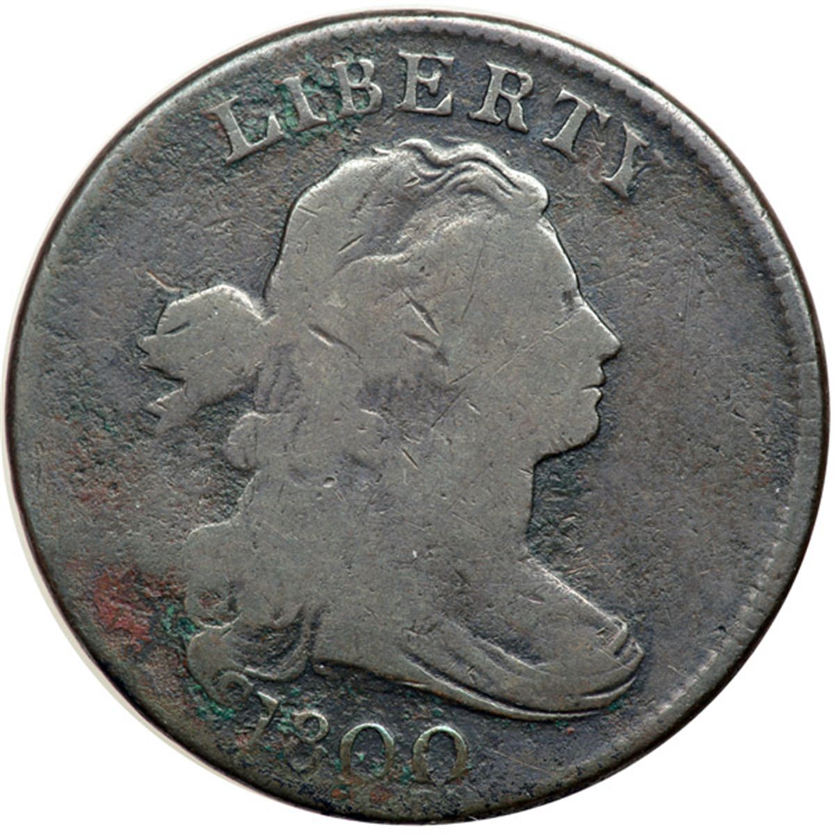 1800 S-201 R4+ G6. A couple points sharper but there is a patch of shallow corrosion with verdigris at the lowest curl and a trail of fine roughness extending from this patch along the base of the date, plus specks of verdigris around LI in LIBERTY. Otherwise the rest of the planchet is reasonably smooth with only minor distractions. Glossy steel brown and chocolate blending to olive brown in protected areas. MDS, Breen state III, with swelling at D-STA. The date and legends are complete and clear.