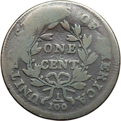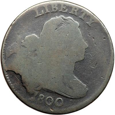 1800 S-202 R4+. Good-6. The obverse is slightly weaker due to the severe die failure while the reverse is a bit stronger, the G6 grade an average of the two. Glossy chocolate brown with lighter steel brown toning on the highpoints. No roughness or verdigris, and the only marks are some tiny ticks in the field before the portrait. Overall a nice example for the grade with a clear date. Terminal die state, Breen state VII, with massive die failure and swelling that obliterates details on both sides. Removed from an NGC slab graded G4 (NGC label included, and it shows the attribution and Reiver provenance). DWH #2875.