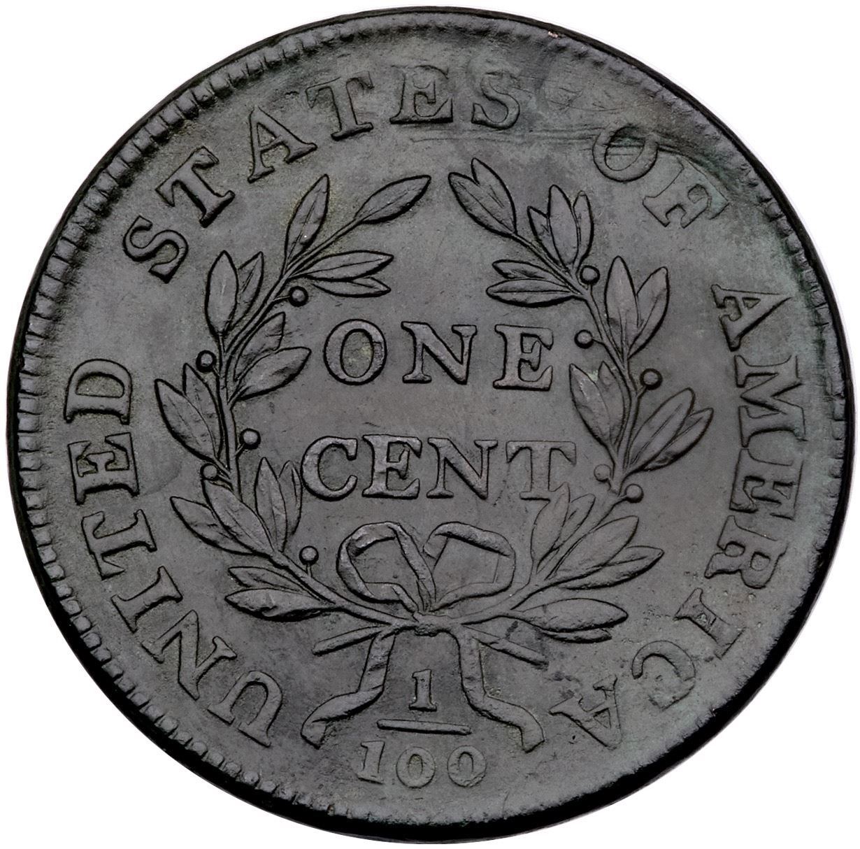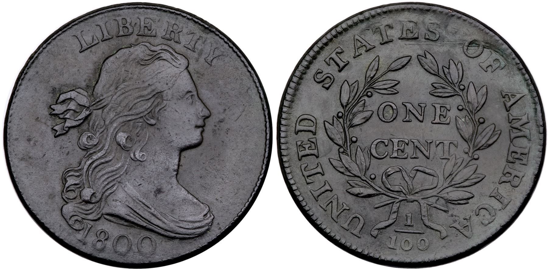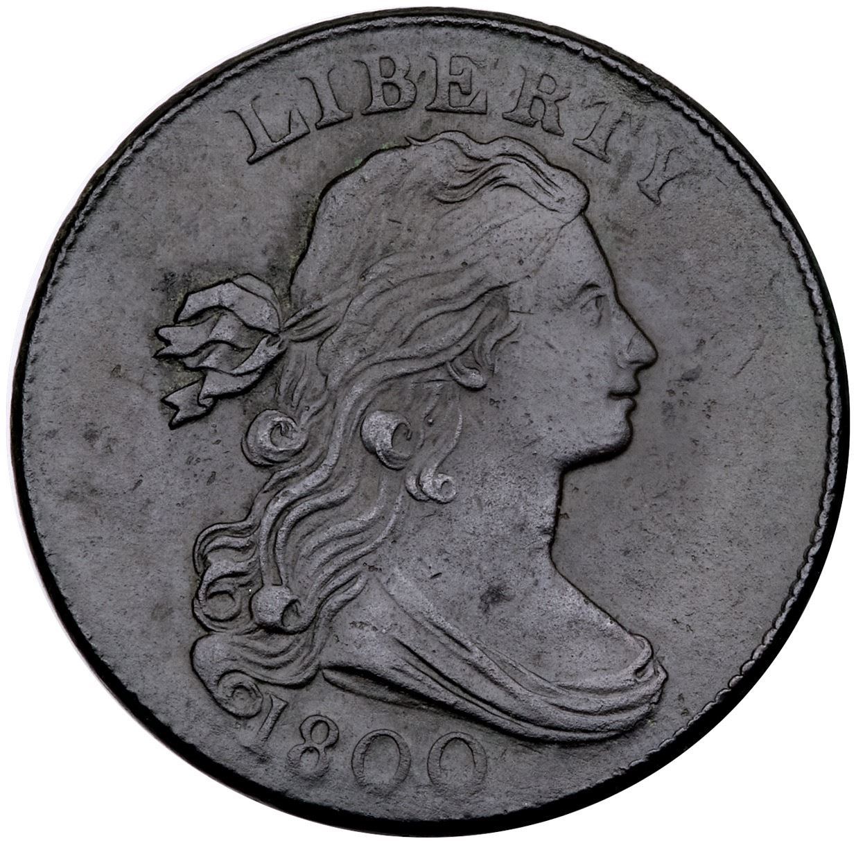 1800 S-203 R-3 VF30EF45 sharpness but dark with traces of shallow verdigris in some fields and protected areas. Now a rather glossy deep steel and olive patina, with only a couple trivial ticks in the field, nothing noteworthy or distracting. LDS, Breen state V, with the obverse die bulges and heavy reverse die clashing.Certificate Number: Pedigree: