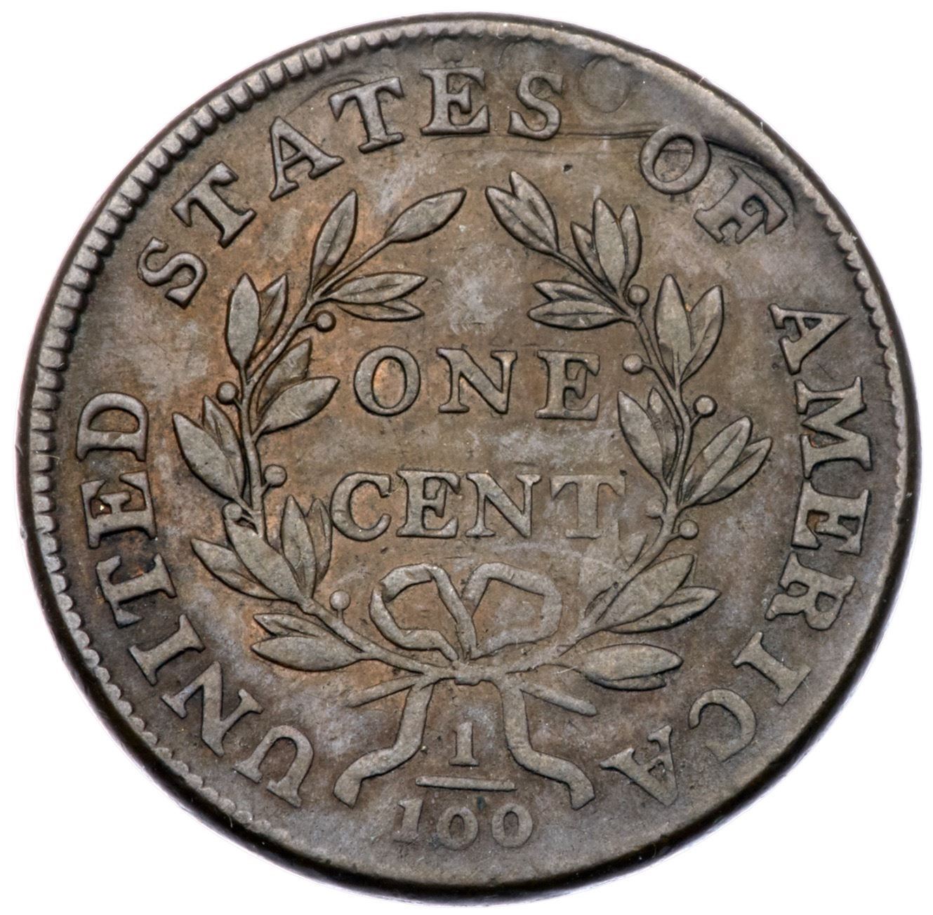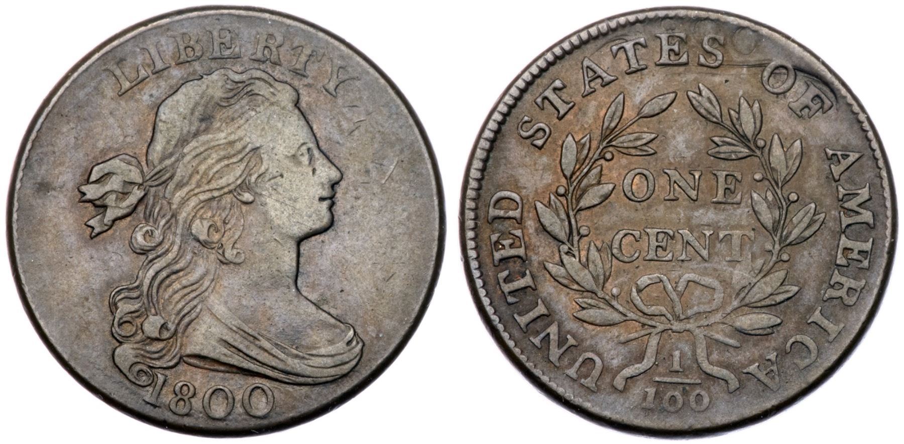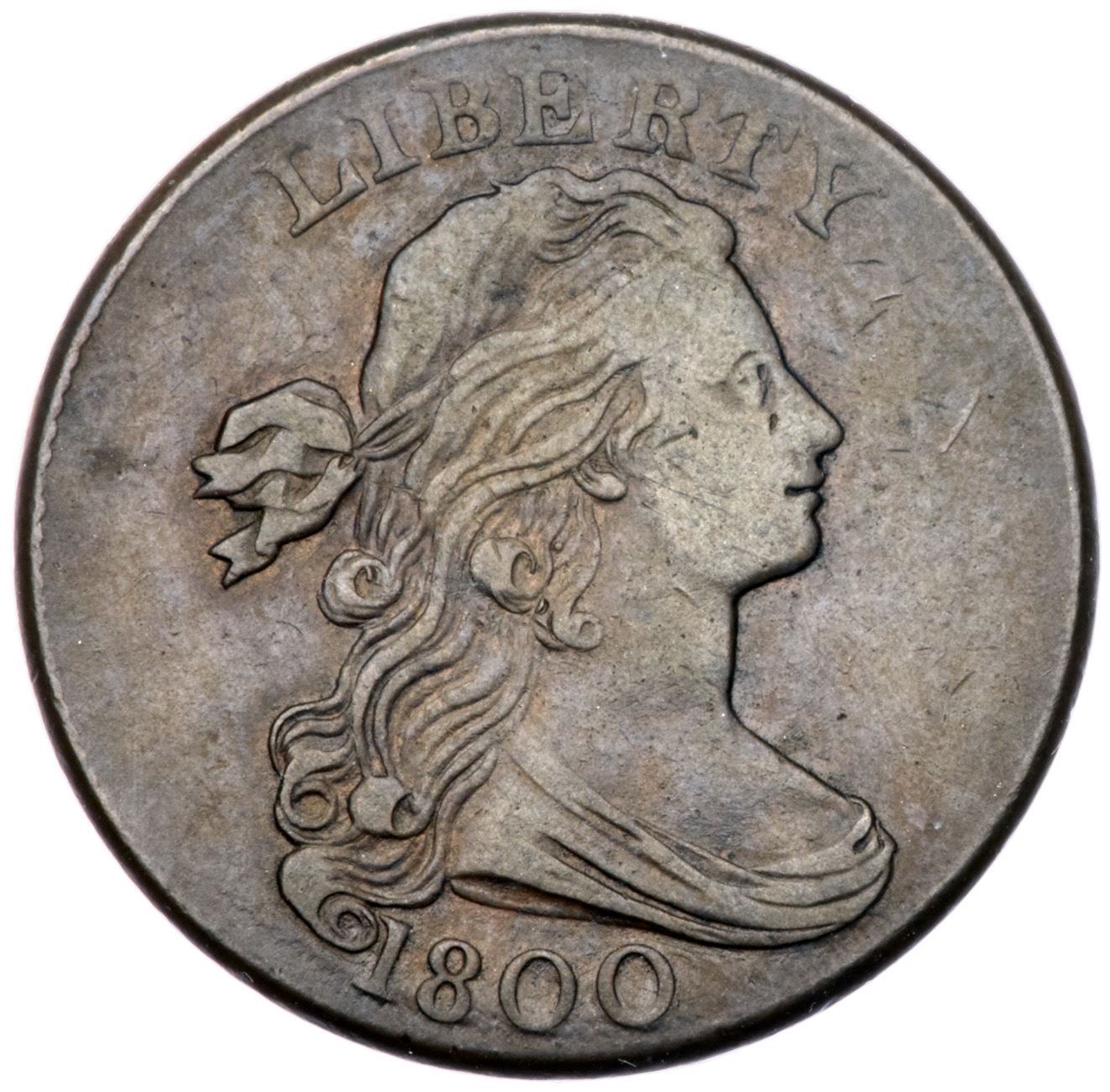 1800 S-203 R3 VF25+Glossy brown and olive blending to reddish chocolate brown in protected areas. Smooth with light wear and trivial marks including a tiny nick right of the ear and a couple more in the field before the face. MDS, Breen state III, with double clashmarks, strongest at the top of the reverse. Graded VF30 net VF20 by Noyes, his photo #29205 (no idea why there is a 10-point deduction). A very nice mid-grade 1800 cent.Certificate Number: Pedigree: Ex Ted Kress (given name Theodore Kryworuka but changed to Ted Kress by Del Bland for provenance purposes because it was so difficult to pronounce)-Fred H. Borcherdt Collection