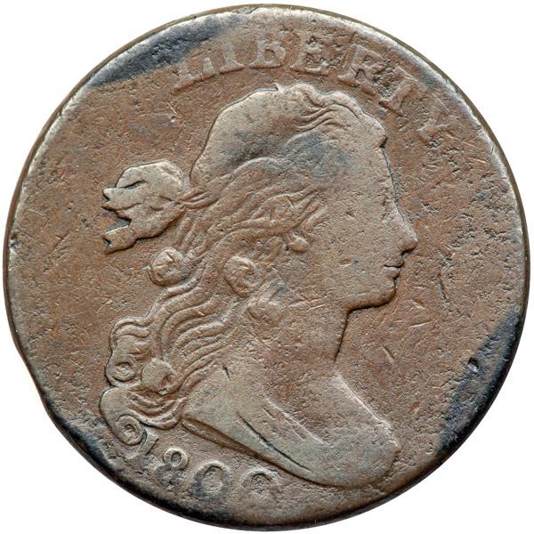 1800 S-203 R3 VG8. Several points sharper but the planchet is very slightly bent. The bend is nearly imperceptible. Mostly glossy chocolate brown but there are a couple arcs of darker olive brown toning on both sides. There is a trace of microscopic roughness in the hair left of the forehead and a couple rim bruises at UNIT. MDS with strong die clashmarks at TES-O. The date and legends are clear.