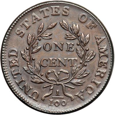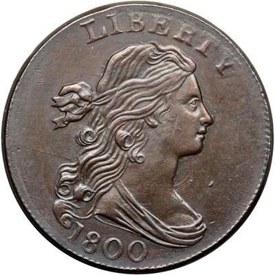 1800 S-205 R4. AU-50 Plus. Sharpness very close to mint state but lightly cleaned and nicely retoned a very attractive uniform glossy chocolate brown. Underlying frosty luster covers the reverse thanks to the extremely fine die rust that covered that die. The obverse fields are smooth and hard showing only sharp die clashmarks and no die rust. No spots or stains. The best identifying mark, and it is barely visible, is a short, dull diagonal hairline scratch between the F in OF and adjacent A in AMERICA. Great eye appeal. M-LDS, Breen state III. Die cracks connect RICA and the denominator and multiple die clashmarks are visible on both sides. A terminal crack through the base of the denominator has not formed. Called MS60 and tied for CC#3 in the Bland census. Noyes says AU50 choice and tied for CC#4, his photo #29415. Comes from a long line of highly credentialed collectors. DWH #3443.