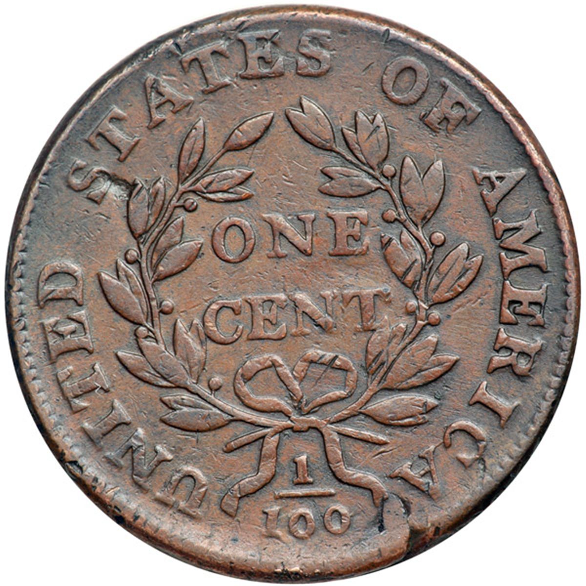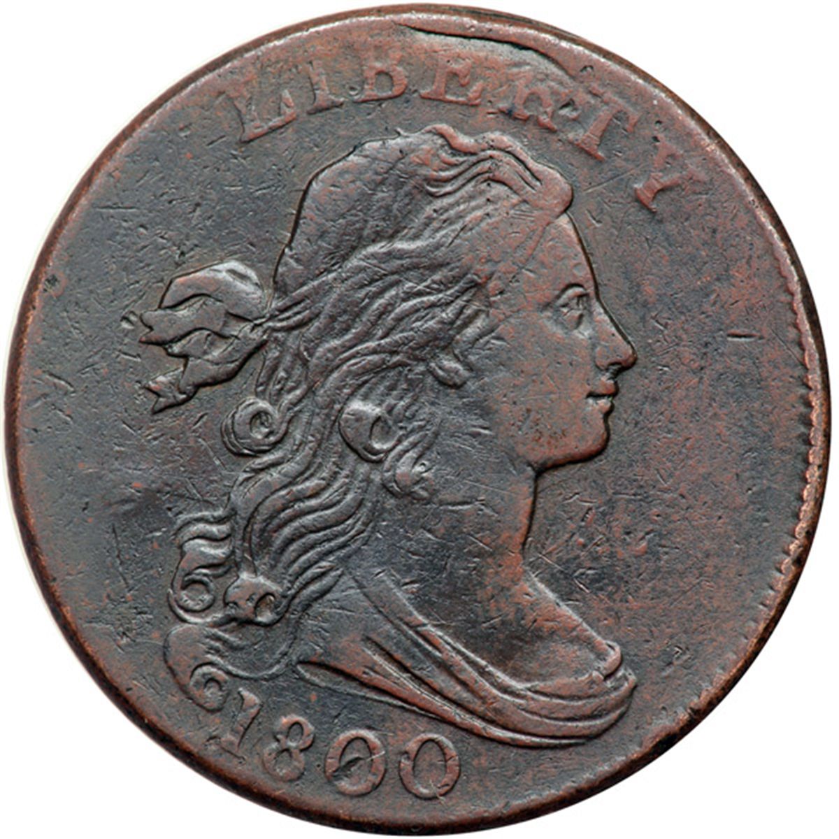 1800 S-205 R4 F15. Ten points sharper but there is a planchet crease through the top of ER in LIBERTY with a corresponding planchet fold at the ribbon end right of the fraction, as struck. In addition a small dent at the bottom of the first S in STATES was strong enough to leave a subtle bulge in the field under the lower end of the hair ribbon. Lightly cleaned and retoned a slightly glossy chocolate brown mixed with lighter chocolate and steel brown tones. M-LDS, Breen state II.