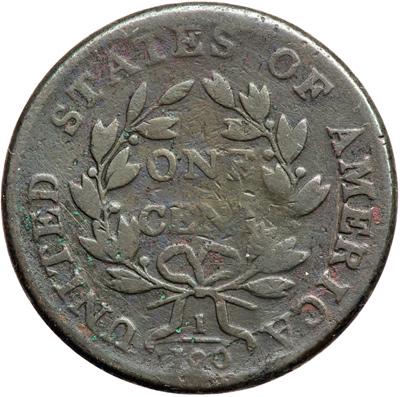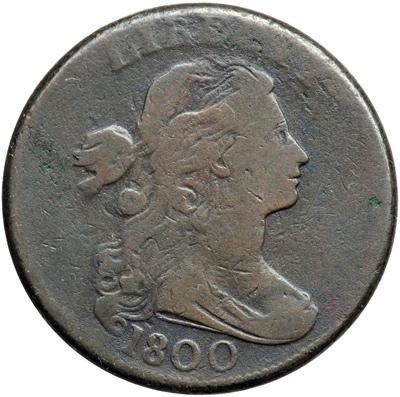 1800 S-207 R3. VG-8. Glossy olive brown and chocolate. The only notable defects are some microscopic specks of greenish verdigris around UNITED. Smooth and nice for the grade. The date is strong and the legends are easily readable. Usual die state with a small cud break under the fraction.