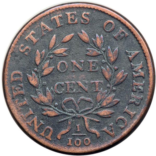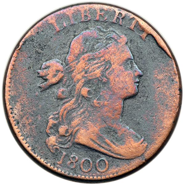 1800 S-208 R3 G6. Sharpness F12 but covered with very fine porosity on all but the highpoints. Lightly cleaned with coppery tan toning on the highpoints and dark olive and steel toning covering the protected areas. No marks or verdigris. The date and legends are complete and strong. LDS with a strong cud break at TY and beyond to the right. Might benefit from a decent retoning.