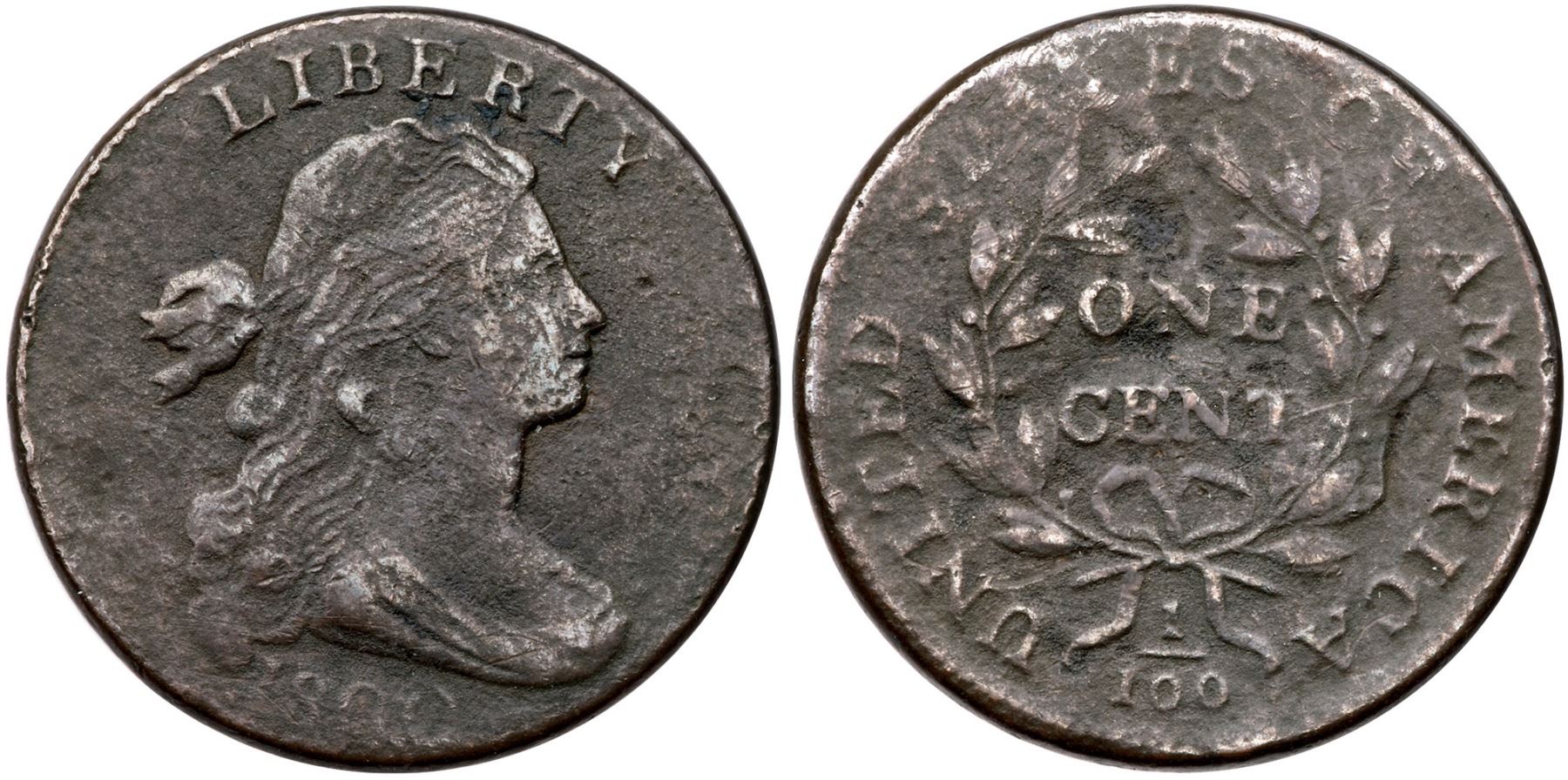 1800 S-210 R-5 VG8VF sharpness but corroded with granular surfaces. A dull hairline scratch in the hair and a deeper scratch at the wreath below ERI are the notable marks. Full date and legends. Ex; Henry Hettger