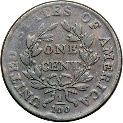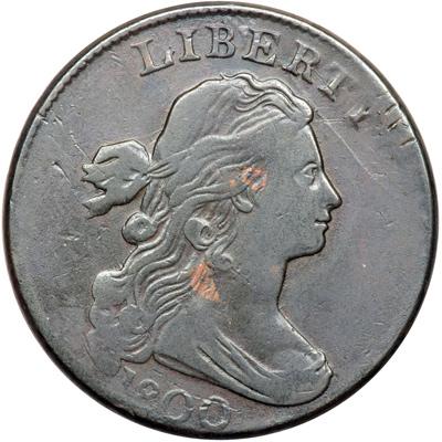 1800 S-210 R5+. Fine-12. Slightly sharper with a small rim dent under the left side of the fraction. Otherwise the surfaces are smooth, free of any notable contact marks or verdigris. Glossy dark chocolate brown with two small splashes of lighter brown toning on the portrait. MDS, Breen state VI. A die crack at ER in LIBERTY extends through the forelock into the field and an additional die crack shows down from the rim through the top of AM in AMERICA. The date and legends are clear. Called VF25 net F12 and tied for CC#5 in the Noyes census, his photo #31934. Also graded F12 but tied for CC#6 in the Bland/Breen census. This cent comes with an impressive provenance. DWH #3456.