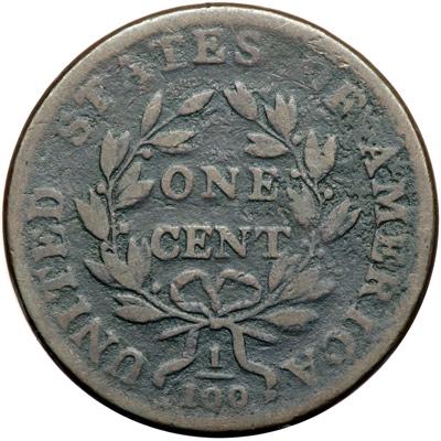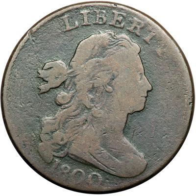 1800 S-210 R5+. VG-8. A couple points sharper with a rim nick behind the head and the surfaces are very slightly rough, strongest at OF-AMER. No verdigris, and the minor roughness is mostly hidden by the rather glossy chocolate and olive brown patina. The date and legends remain clear. E-MDS, Breen state II, with light die clashmarks on the obverse. Called F12 net VG8 and tied for CC#11 in the Noyes census, photo #35929. DWH #2802.
