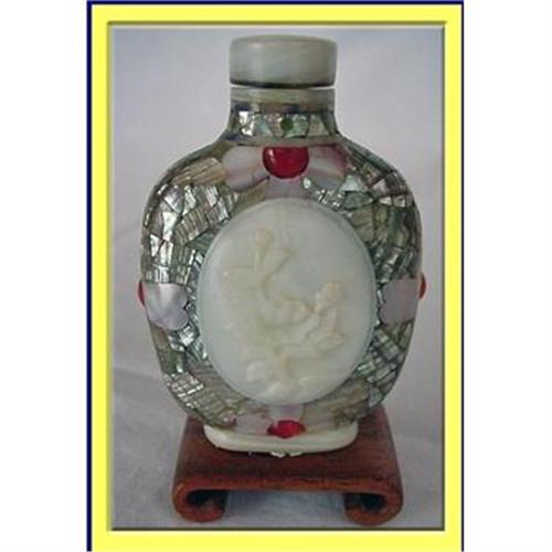 Antique Chinese snuff bottle, inlaid mother of pearl set with carnelian and with a pair of carved white jade plaques. Agate and shell stopper.