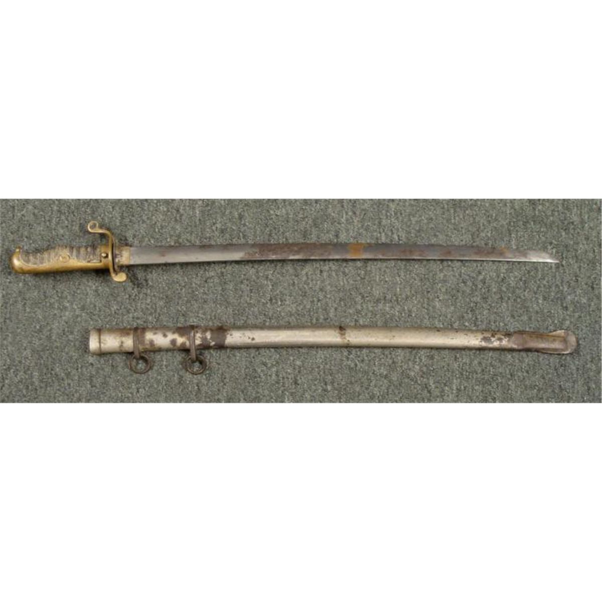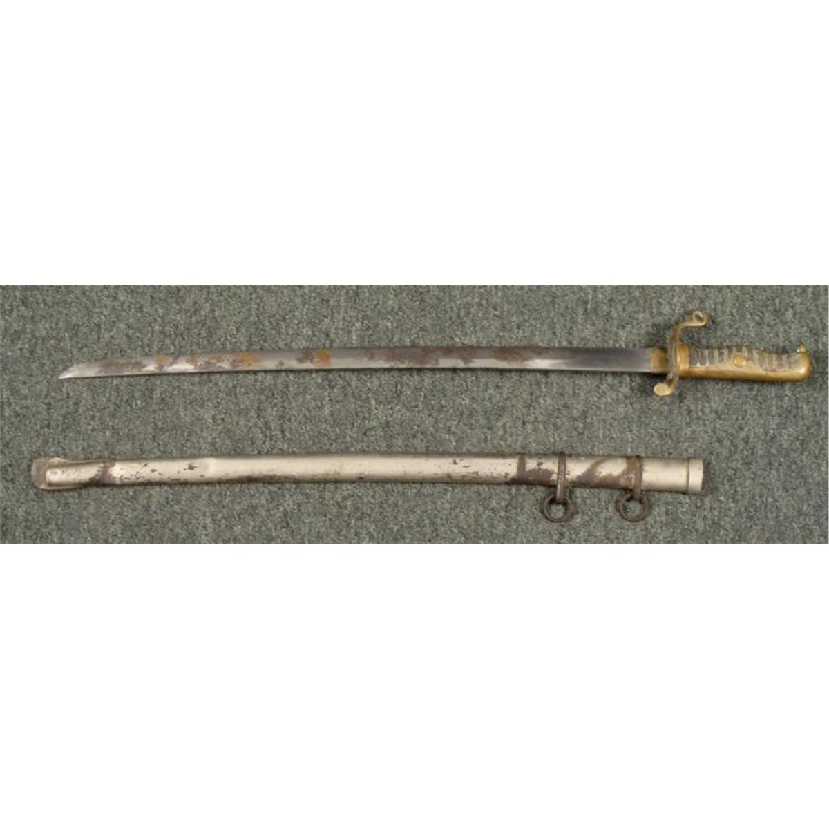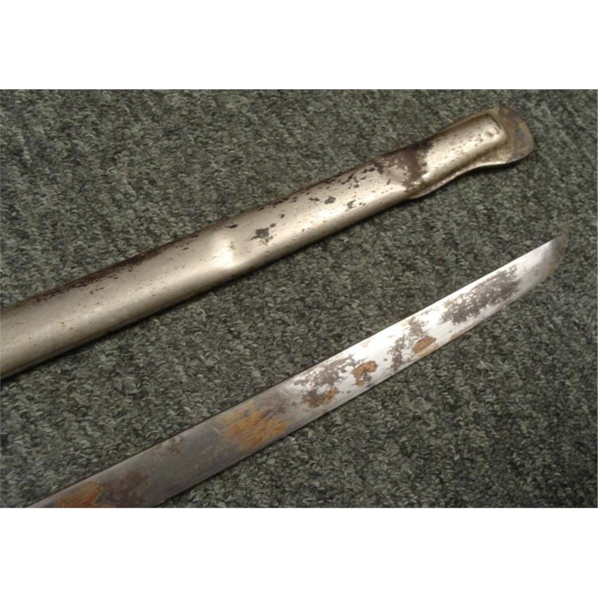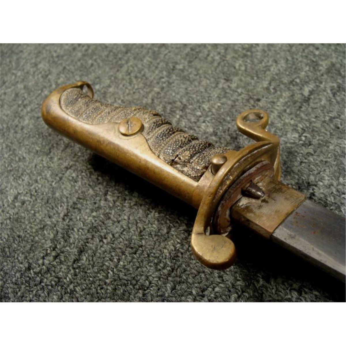 1800'S JAPANESE GOVERNMENT OFFICIAL'S SAMURAI SWORD--ORIGINAL DIPLOMATS SWORD-RARE * AN EXAMPLE OF THIS SWORD IS ON PAGE 108 OF DAWSON'S BOOK "SWORDS OF IMPERIAL JAPAN-1868-1945. VERY RARE SABER-BRASS HILT FITTINGS AND BACKSTRAP-UNIQUE CROSSGUARD WITH ONE END BEING A TEARDROP & THE OTHER ROUND AND CURVED UPWARD--THE HILT IS WIRE WRAPPED AND ORIGINAL DARK SAME (SHARKSKIN)--PUSH BUTTON TO RELEASE BLADE -- 21 1/4" BLADE IS IN TYPICAL SAMURAI SWORD DESIGN--HAS HABAKI AND LEATHER BUFFER BELOW CROSSGUARD--NICKEL PLATED SCABBARD HAS A DOUBLE RING SUSPENSION--SWORD SHOWS AGE AND BLOTCHING--VERY RARE SWORD.TOTAL LENGTH IS 29" *