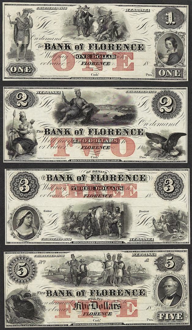 One 1800's $1/$2/$3/$5 Bank of Florence Obsolete Notes.