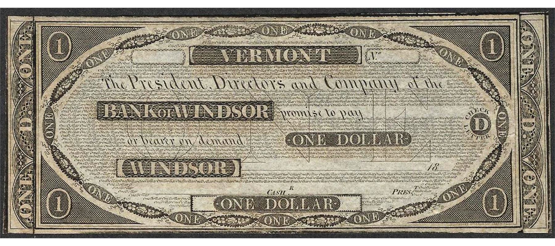 One 1800's $1 Bank of Windsor Vermont Obsolete Note.