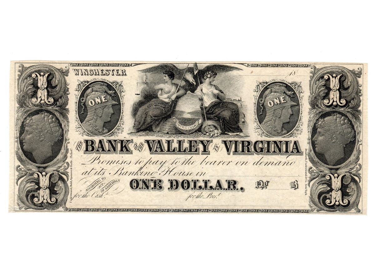 One 1800's $1 Bank of the Valley in Virginia Currency Note.