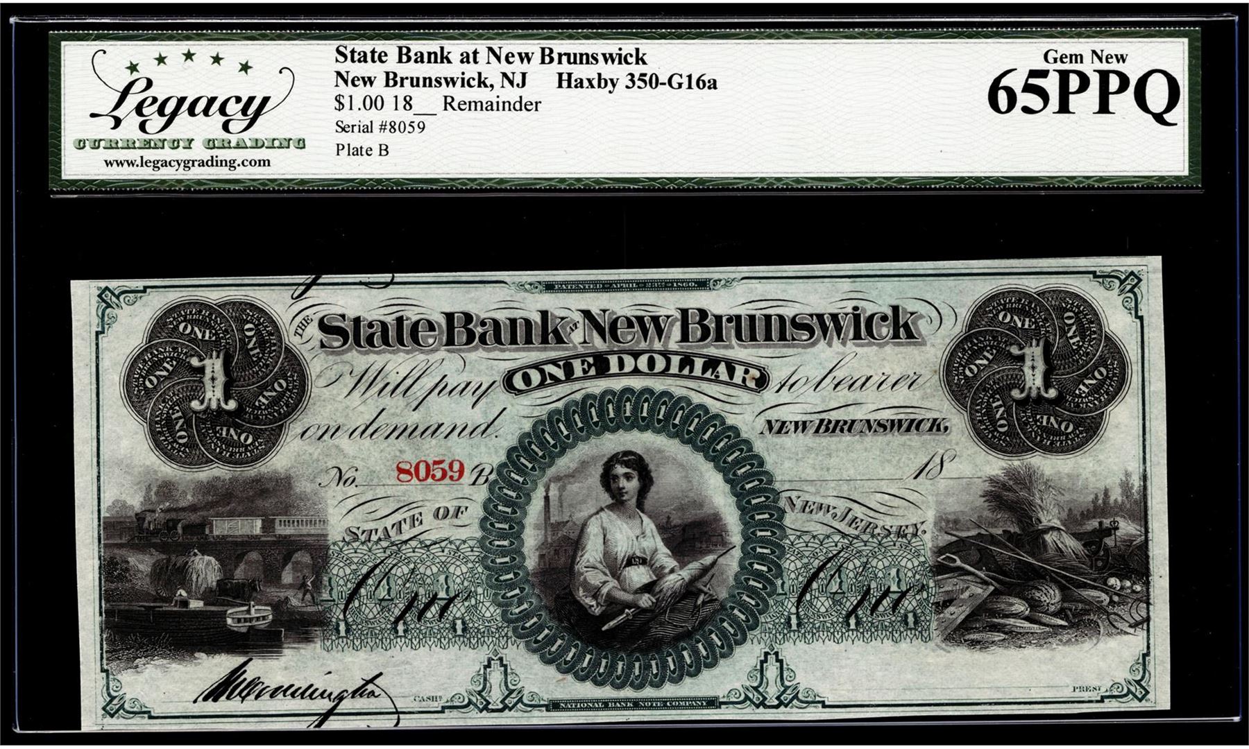 1800's $1 State Bank at New Brunswick, NJ Obsolete Note Legacy Gem New 65PPQ