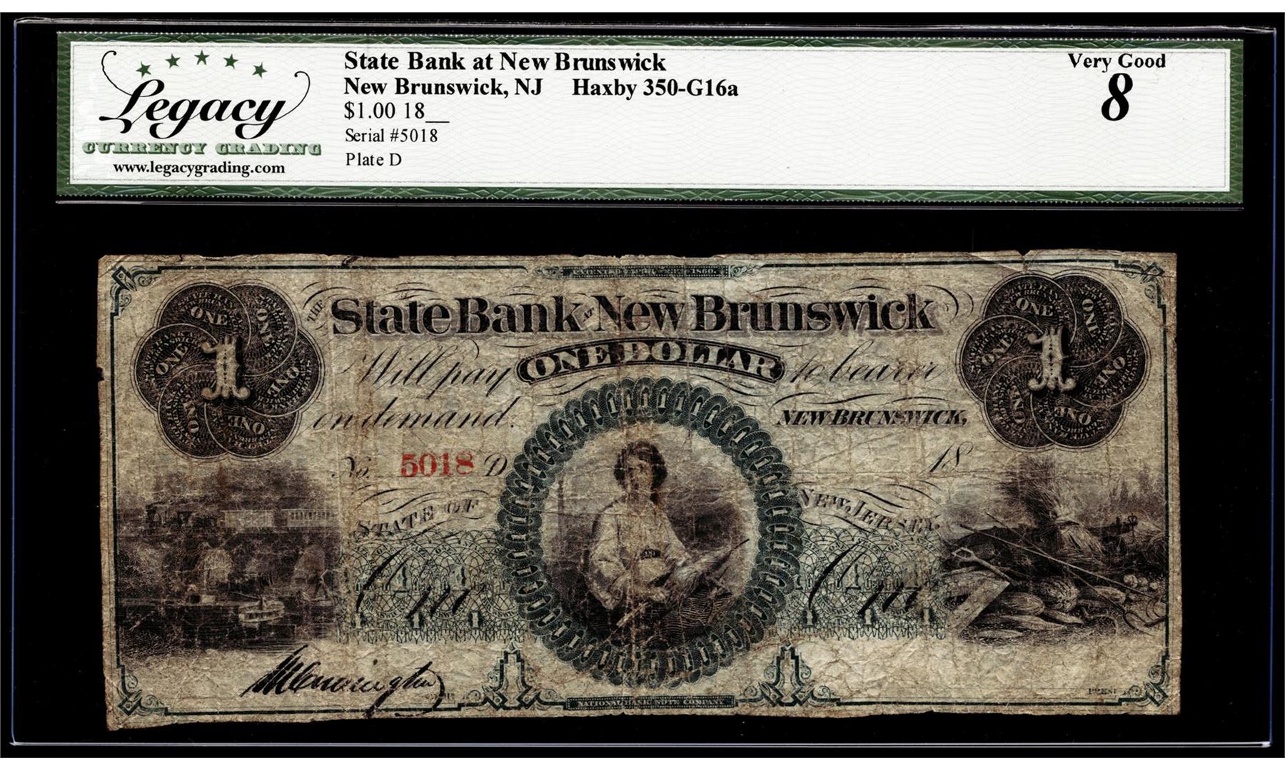One 1800's $1 State Bank at New Brunswick, NJ Obsolete Note Legacy Very Good 8. Legacy Graded.
