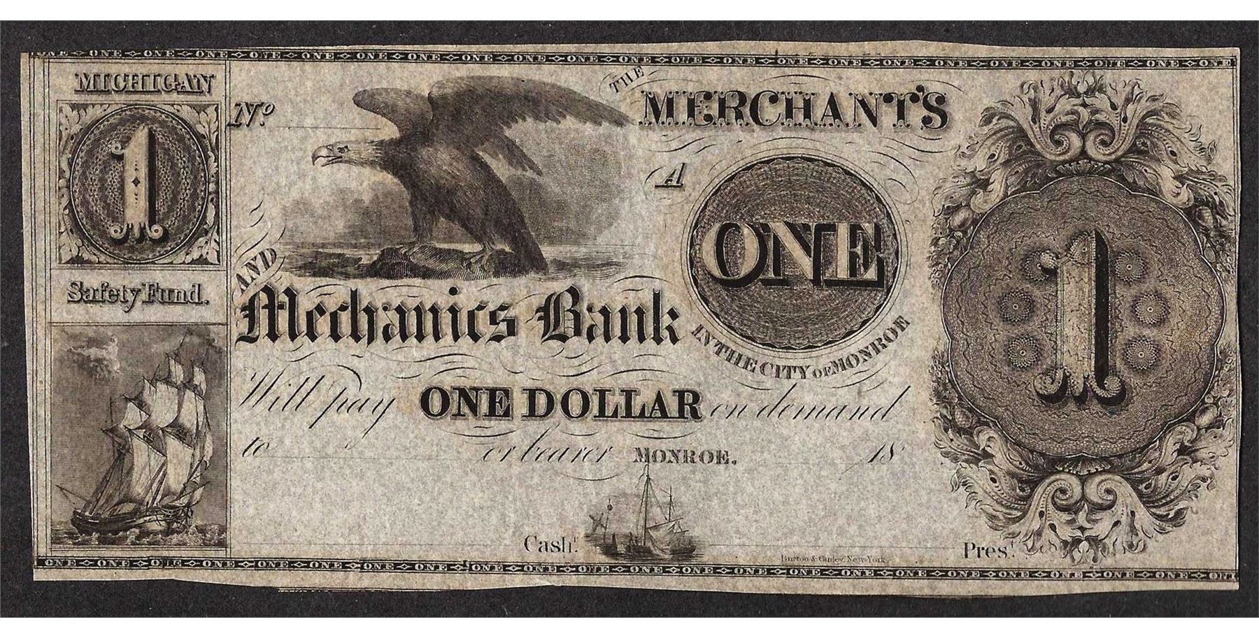 One 1800's $1 The Merchant's and Mechanics Bank Obsolete Note.