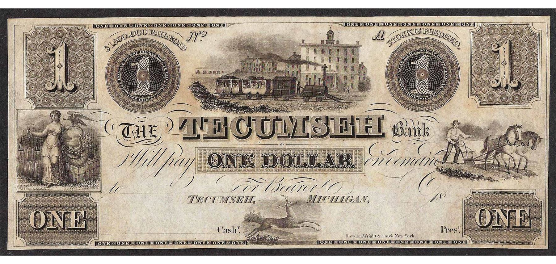 One 1800's $1 The Tecumseh Bank Obsolete Note.