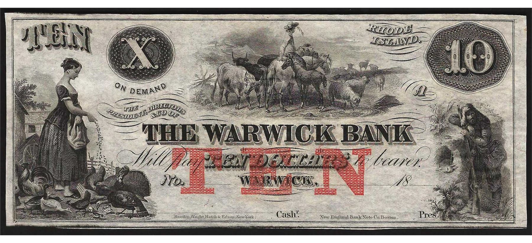 One 1800's $10 The Warwick Bank Obsolete Bank Note.