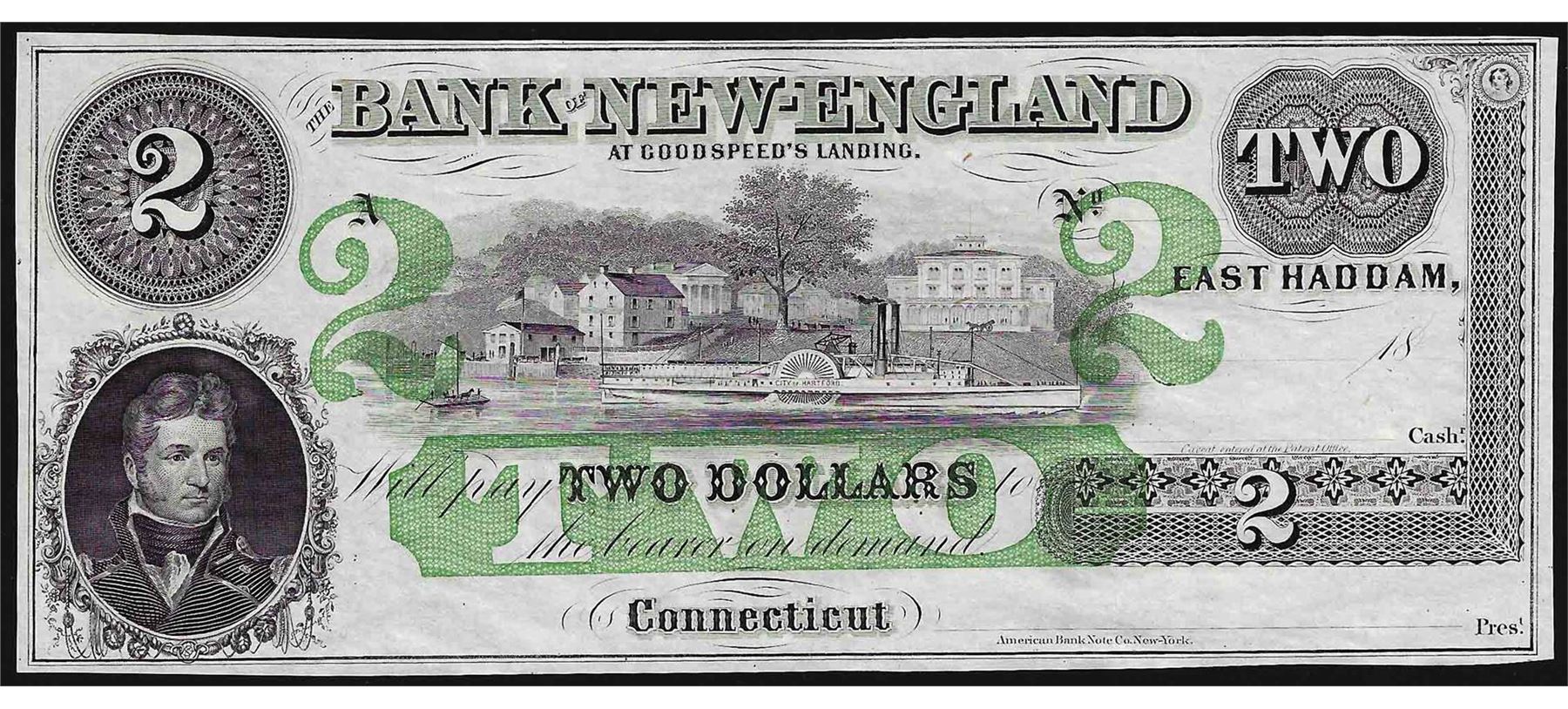 One 1800's $2 Bank of New England Obsolete Bank Note.