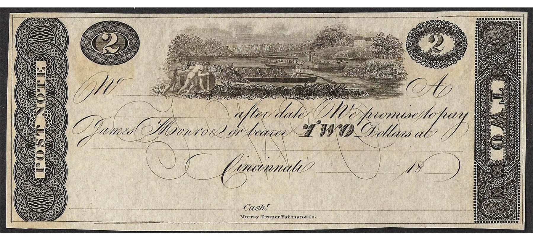 One 1800's $2 Cincinnati Obsolete Post Note.