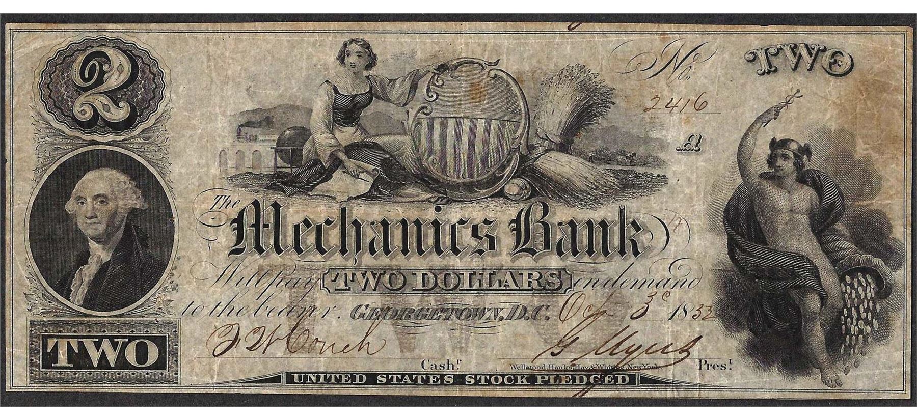 One 1800's $2 Mechanics Bank Georgetown D.C. Obsolete Note.