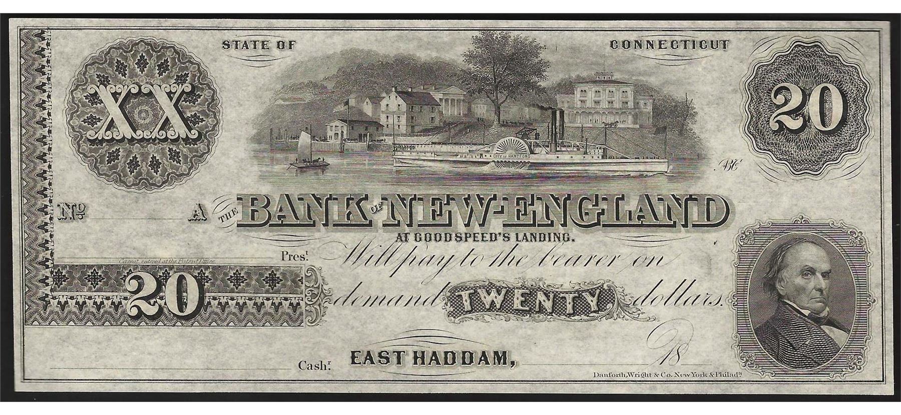 One 1800's $20 Bank of New England Goodspeeds Obsolete Note.
