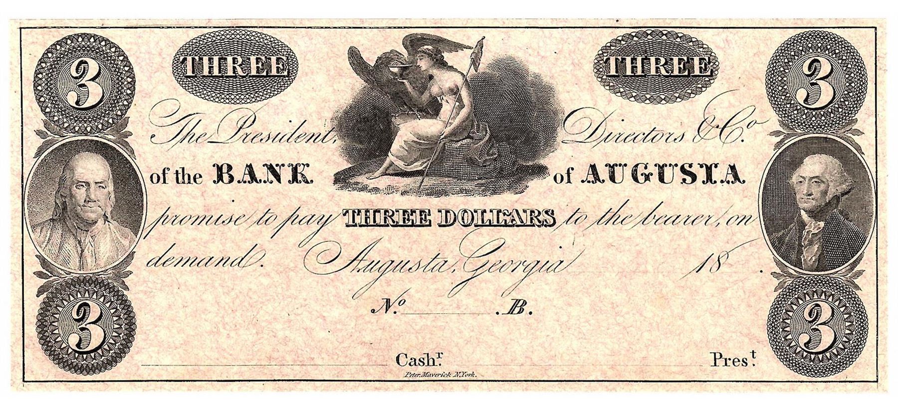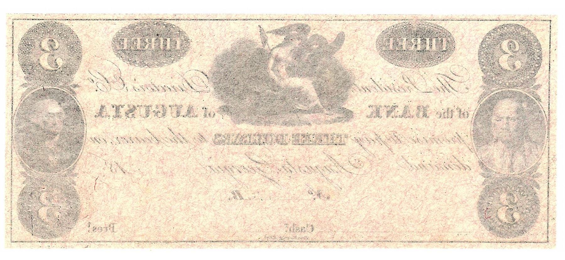 One 1800's $3 Bank of Augusta Obsolete Currency Note.